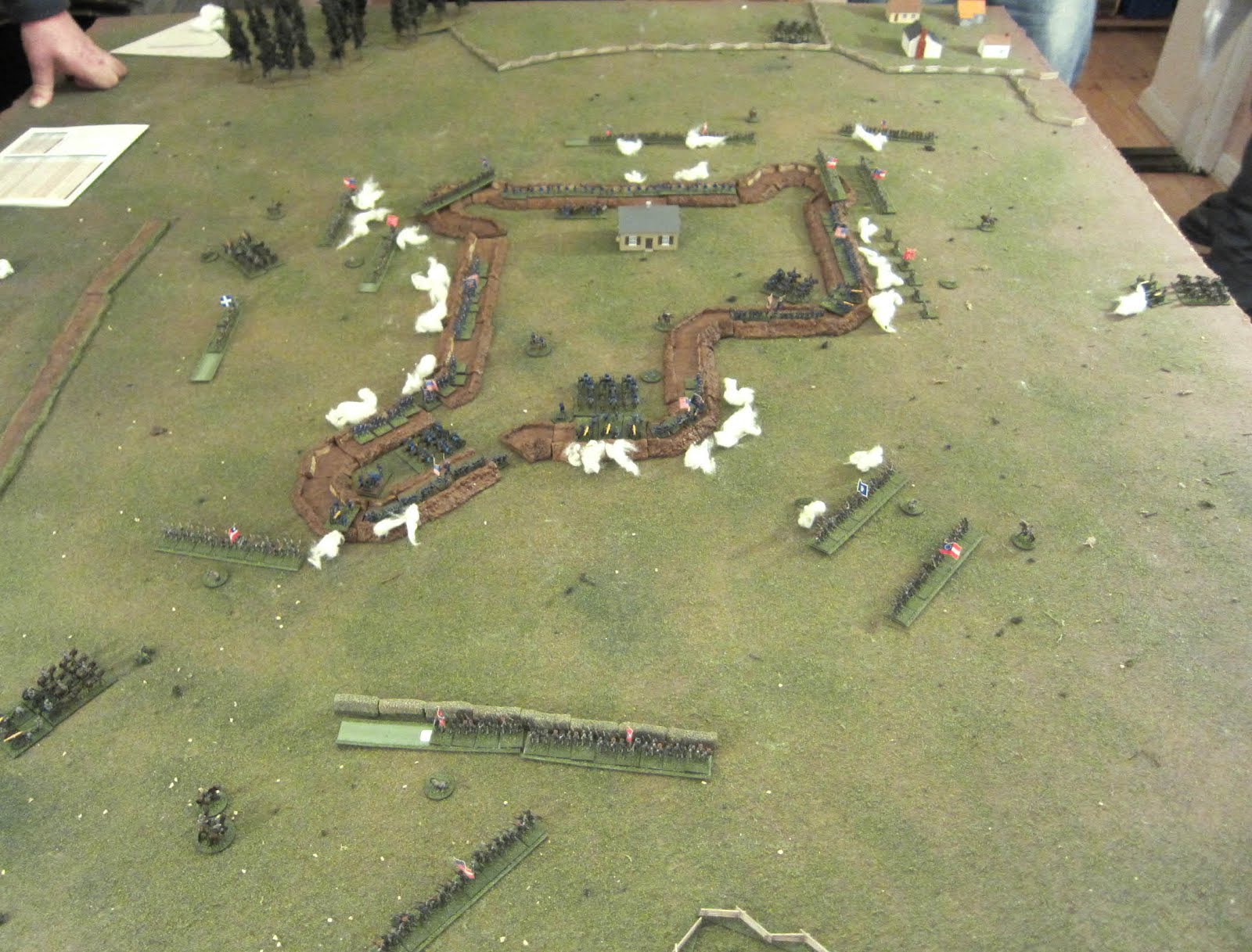 This was a pretty straightforward siege affair where roughly the twice as large Confederate force attacks an Union fortified position. Since we had two newbies with us, non-club members but gentlemen nonetheless I might add, this rather straightforward scenario seemed a relatively good way of showing them the ropes.